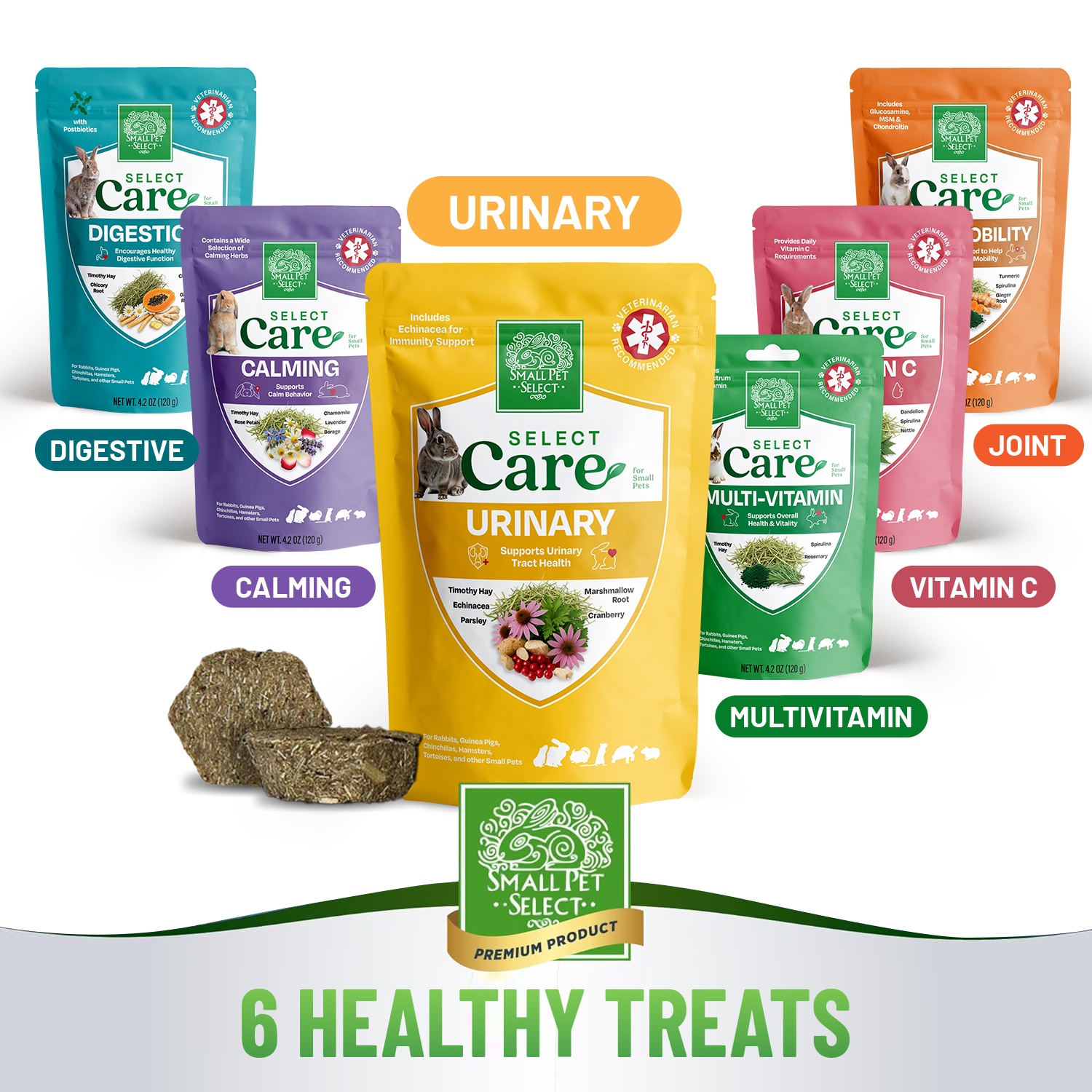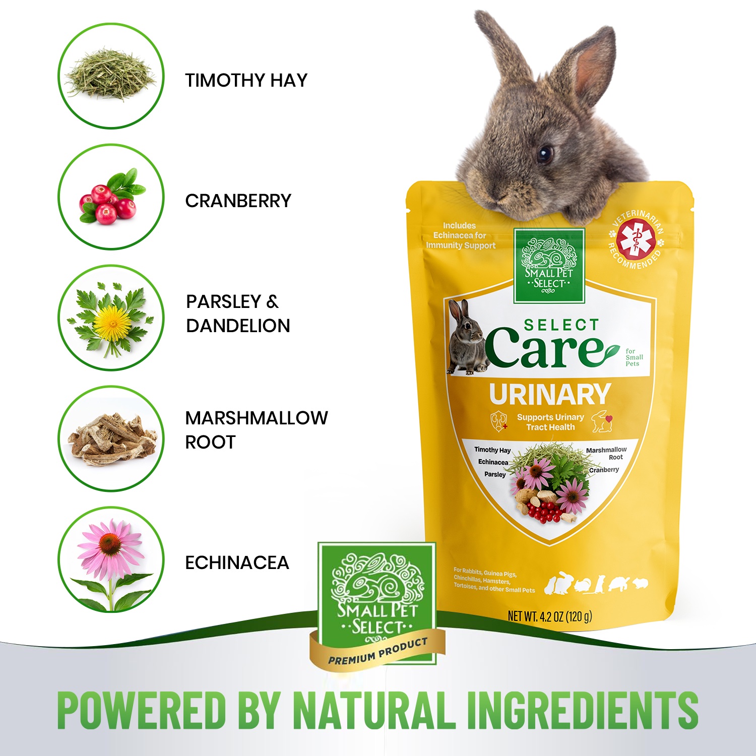 Help maintain your rabbit’s, guinea pig’s or chinchilla’s urinary tract health with Select Care – Urinary Health Support. This specially formulated supplement blends premium timothy hay with carefully selected herbs traditionally used to support healthy urinary function and bladder health in small herbivores.
