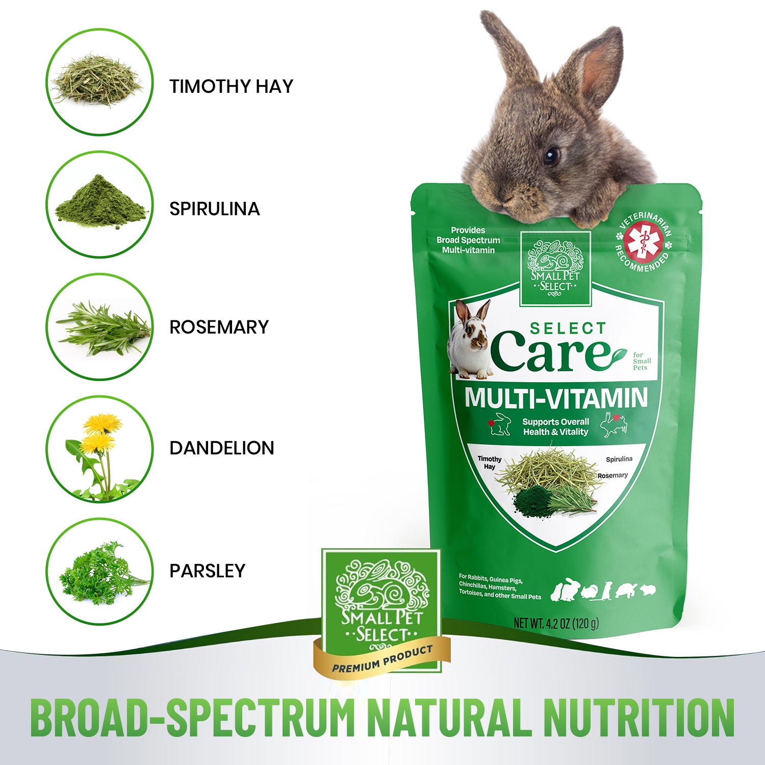 Ensure your small pet receives well-rounded daily nutrition with Select Care – Multi-Vitamin Health Support. This expertly formulated blend combines premium timothy hay with essential vitamins A, D, E and key B-complex nutrients to support overall health, wellbeing and vitality. Natural herbs including dandelion, parsley and nettle add further nutritional value, helping to support skin, coat, immune function and general daily wellness.
