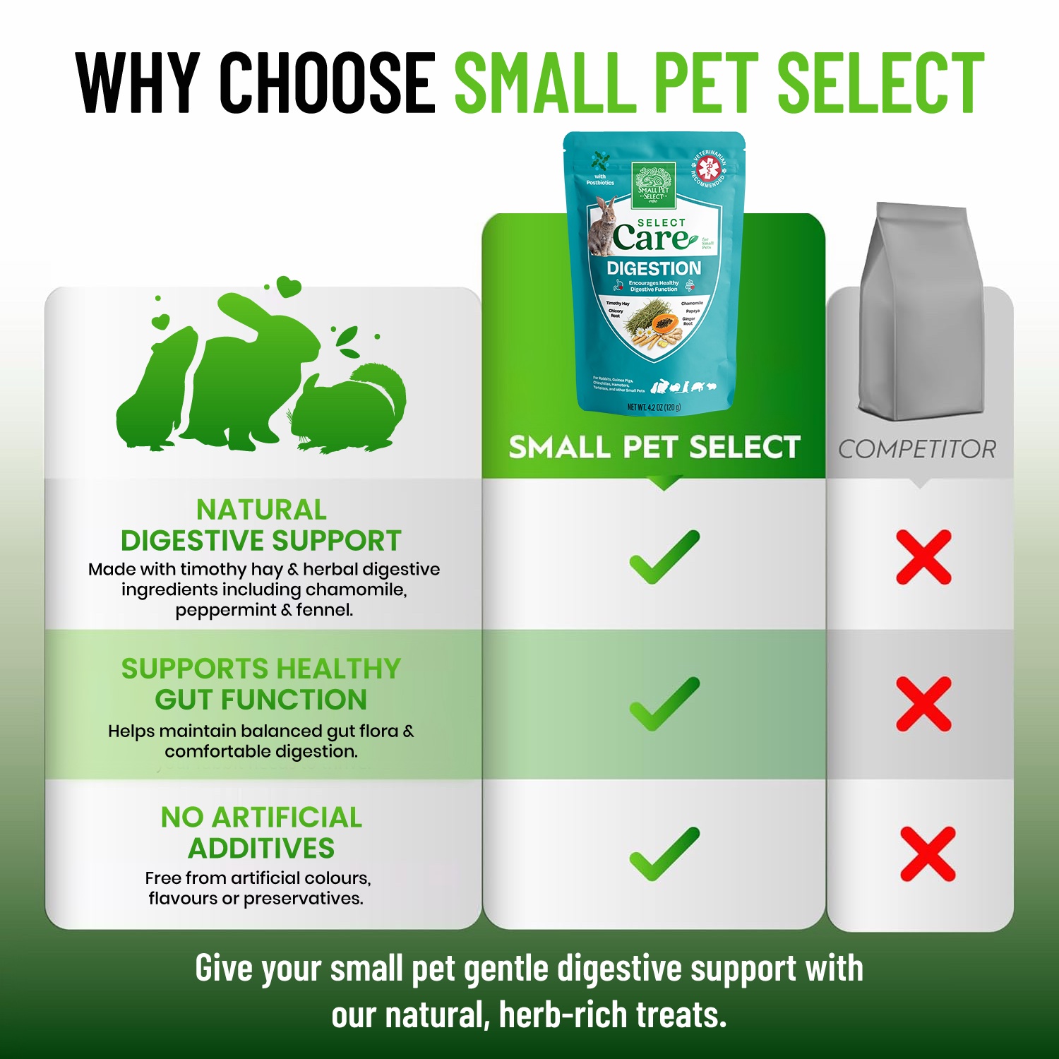 Help maintain your rabbit’s, guinea pig’s or chinchilla’s digestive wellness with Select Care – Digestive Health Support. This specially formulated supplement combines premium timothy hay with a carefully selected blend of digestive-supporting herbs known to promote healthy gut function, comfortable digestion and overall gastrointestinal wellbeing in small herbivores.